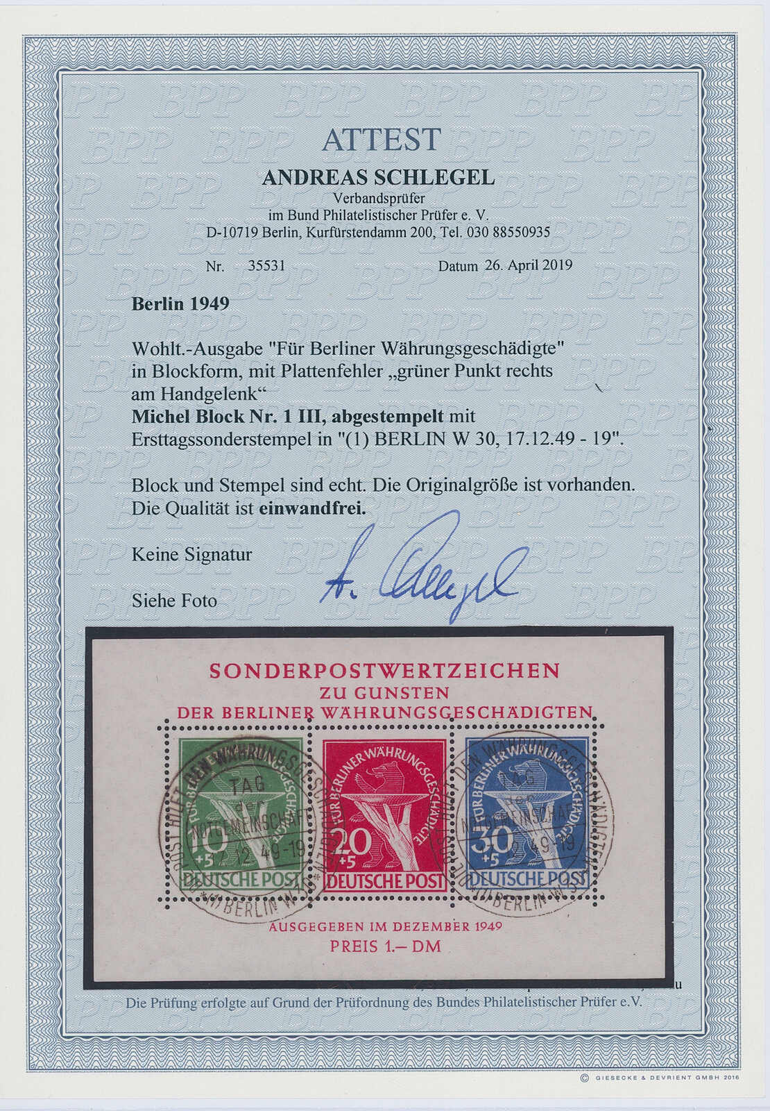 Der Block trägt den Plattenfehler 68 II 'grüner Punkt rechts am Handgelenk'