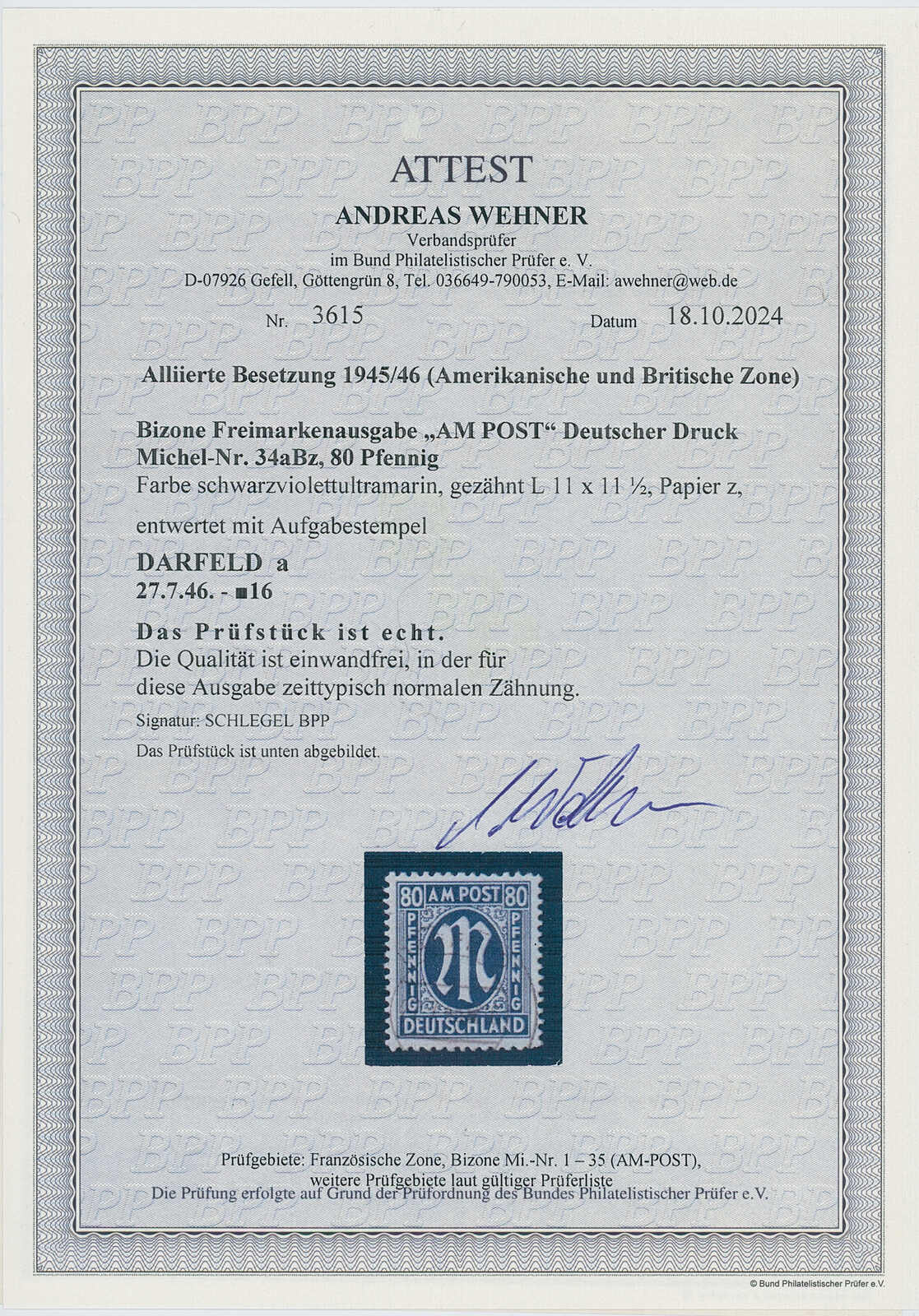 Gepr. Hans-Georg Schlegel und gepr. Wehner mit Fotoattest (2024)