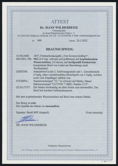 BRAUNSCHWEIG 1857 MiNr. 9 b Z kopfstehendes Wasserzeichen