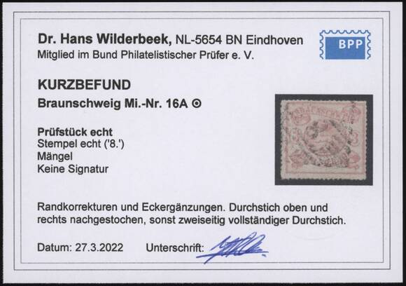 Die Marke ist repariert, so sind die Ränder korrigiert, Ecken ergänzt und der Durchstich oben und rechts nachgestochen