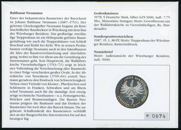 BRD 1978/1987 Numisbrief Balthasar Neumann