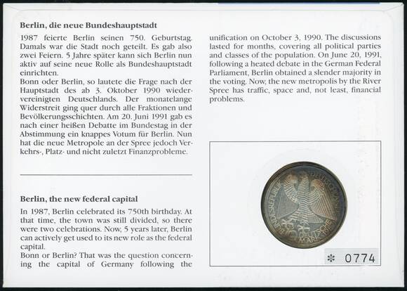 BRD 1987/1992 Numisbrief Berlin 1992, die neue Bundeshauptstadt
