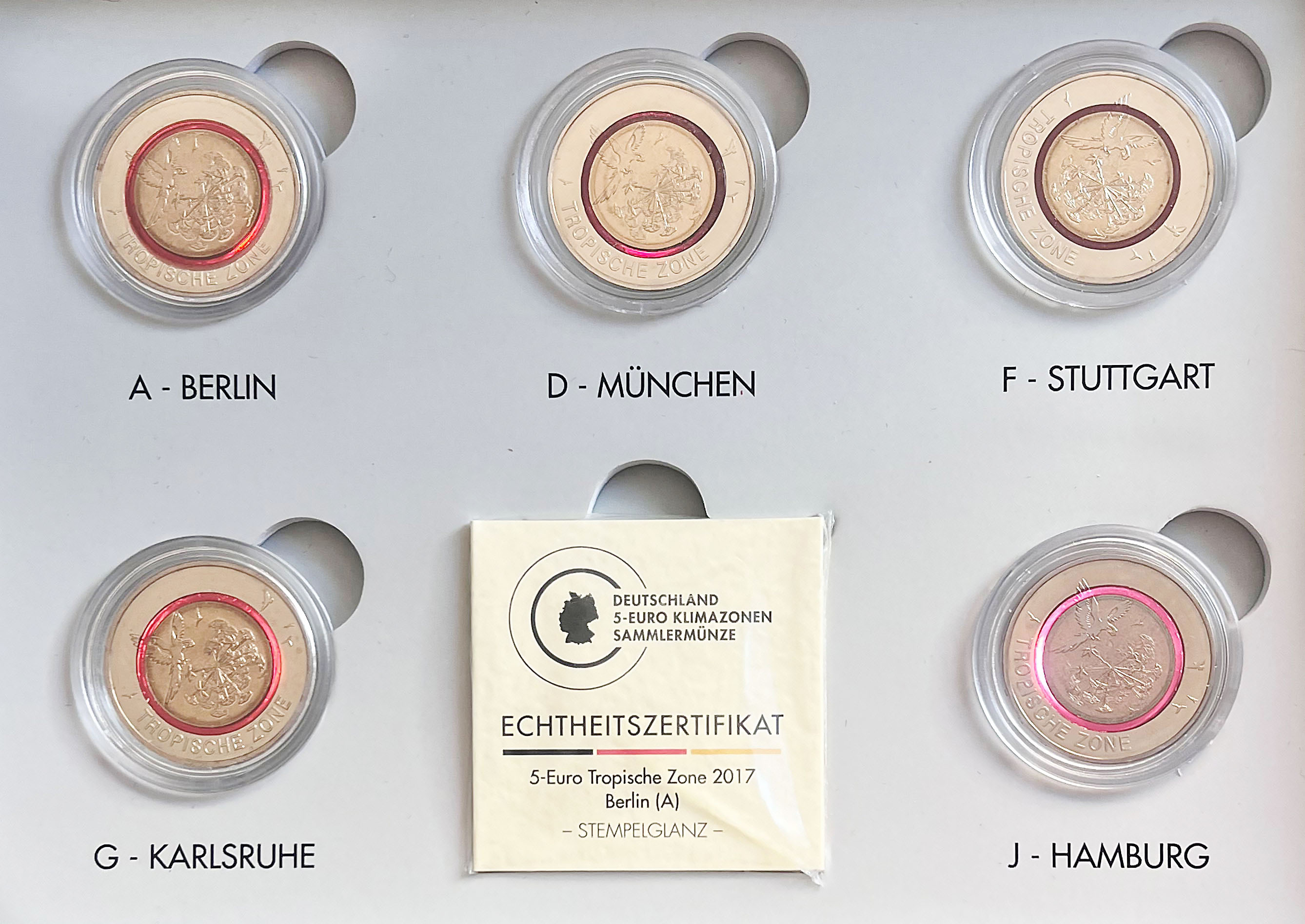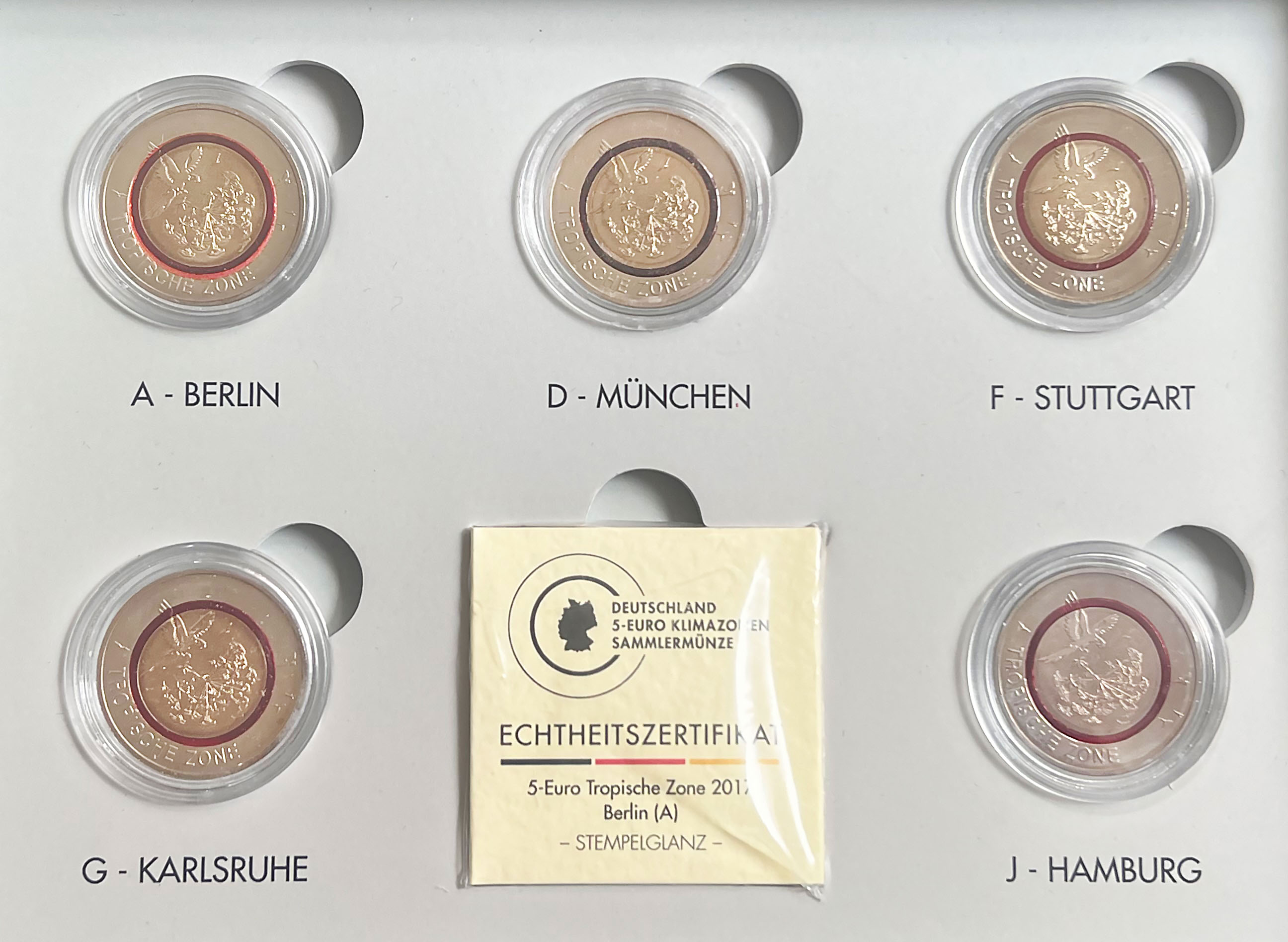 BRD 5 x 5 Euro 2017 Tropische Zone mit Polymerring Komplettsatz in LED-Unterlicht-Box