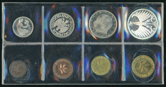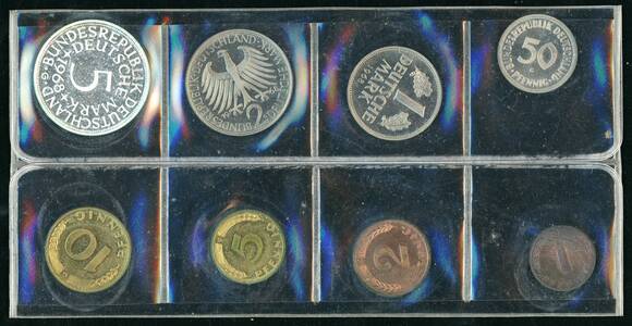 Von 1964 bis 1973 wurden von den vier Prägeanstalten Kursmünzsätze in Spiegelglanz in kleinen Auflagen zunächst in Folie, später in Noppenfolie hergestellt.