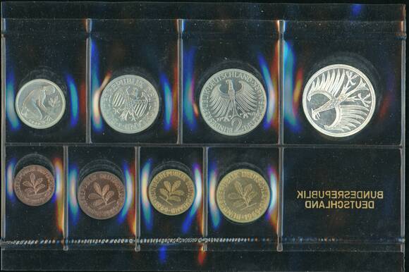 Von 1964 bis 1973 wurden von den vier Prägeanstalten Kursmünzsätze in Spiegelglanz in kleinen Auflagen zunächst in Folie, später in Noppenfolie hergestellt.