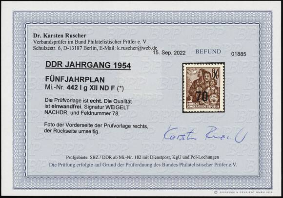 DDR 1954 MiNr. 442 I g XII ND F Nachdruck ohne Stempel