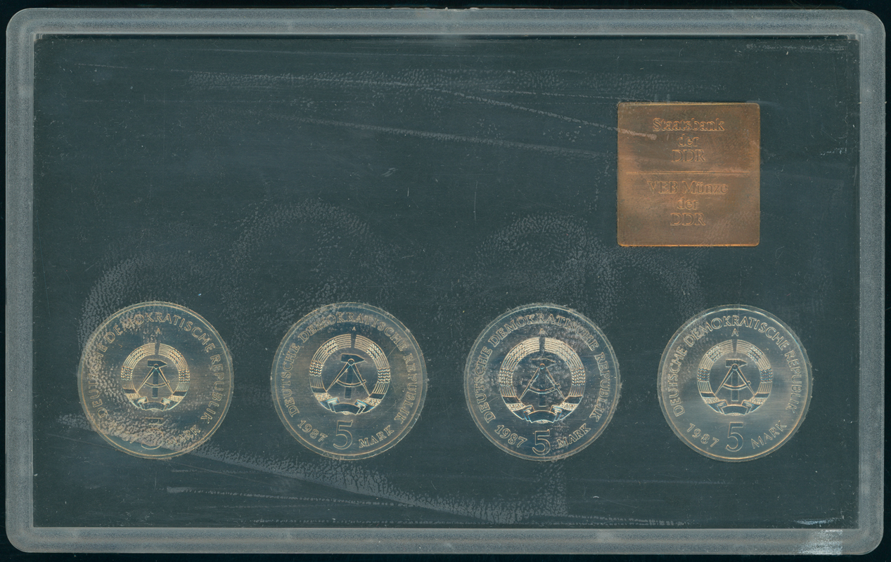 Der Satz enthält neben der Münze zu 5 Mark Brandenburger Tor 1987 die Gedenkmünzen 5 Mark Alexanderplatz, Rotes Rathaus und Nikolaiviertel