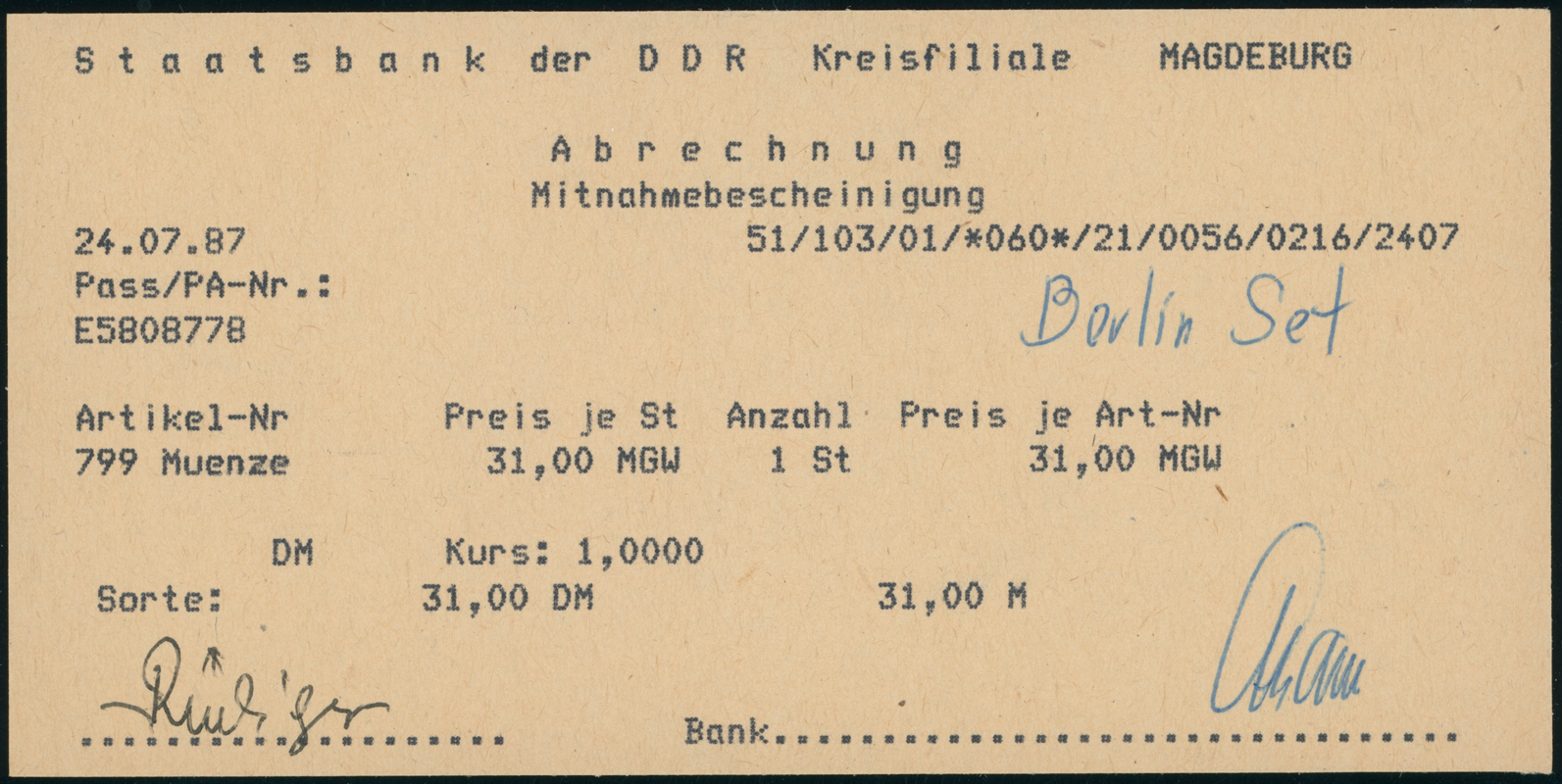Dazu eine original Kauf-Quittung von 1987 der Staatsbank der DDR über 31 Mark