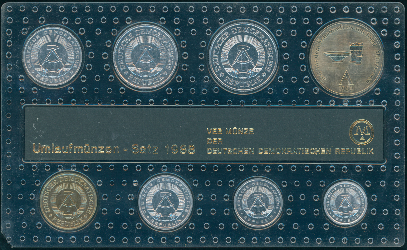 Der Satz enthält neben den Kursmünzen des Jahres 1988 von 1 Pfg. bis 2 Mark eine Medaille des von Schadow gefertigten Wandfrieses der alten Berliner Münzstätte mit dem Motiv "Strecken"