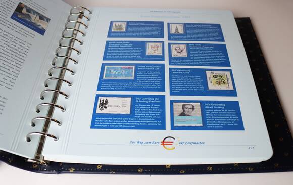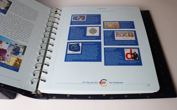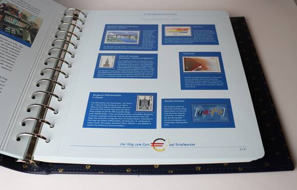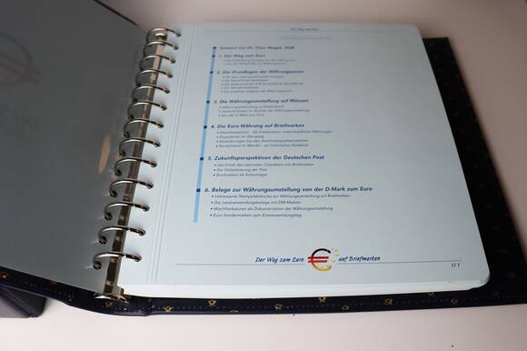 Schöne und sehr informative Motiv-Sammlung 'Der Weg zum Euro auf Briefmarken' im Spezialalbum aus ehemaligem Deutsche Post Abonnement