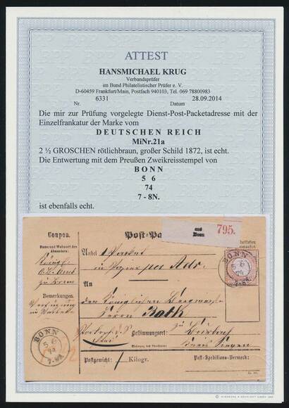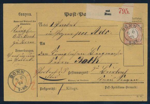 Als portogerechte Einzelfrankatur auf vollständiger Paketkarte von 'BONN 5 6 74' nach Burbach
