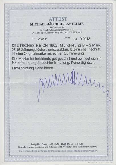 1902, Deutsches Reich ohne Wasserzeichen, 2 Mk., schwarzblau, lateinische Inschrift