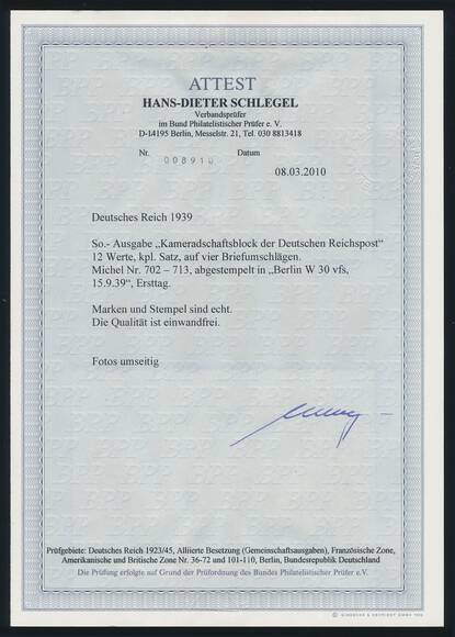 1939, Kameradschaftsblock der Deutschen Reichspost I, 12 Werte komplett