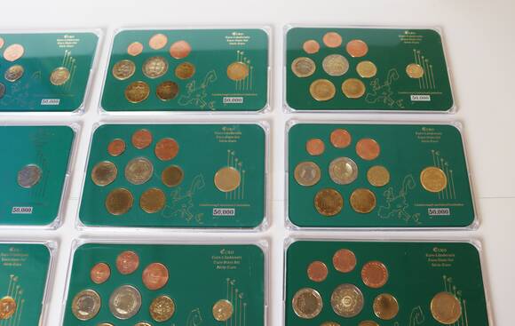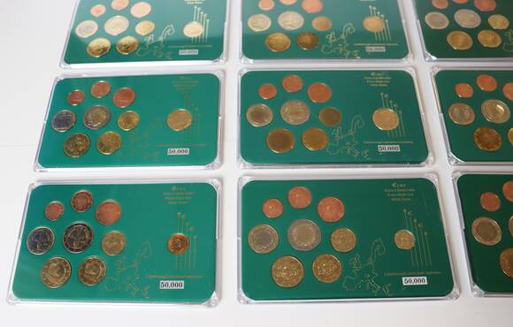 Jeder Satz enthält einen Euro-Kursmünzsatz sowie eine Münze der jeweiligen, alten Landeswährung