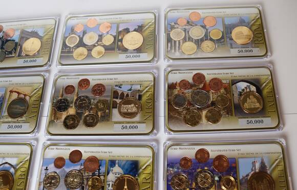 Jeder Satz enthält einen Euro-Kursmünzsatz von 1 Cent bis 2 Euro sowie eine vergoldete Medaille mit einer Sehenswürdigkeit des Landes