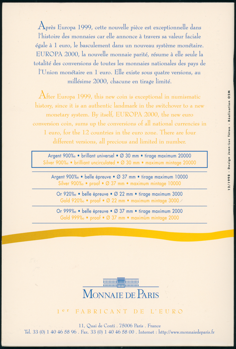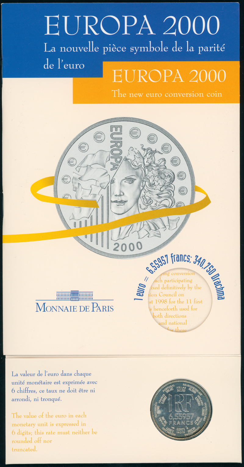 FRANKREICH 2000 1 Euro = 6,55957 Francs Silber