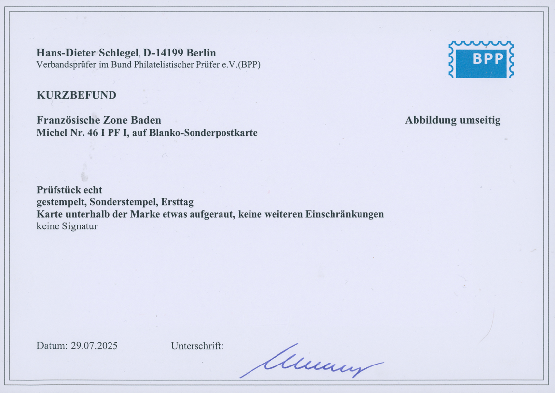 FZ BADEN MiNr. 46 I PF I, guter Plattenfehler auf amtlicher Ersttagskarte