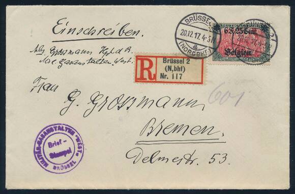Als Einzelfrankatur auf überfrankiertem R-Brief von Brüssel nach Bremen mit Ankunftsstempel
