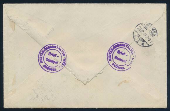 Links und rückseitig violette Briefstempel der Militär-Gasanstalten