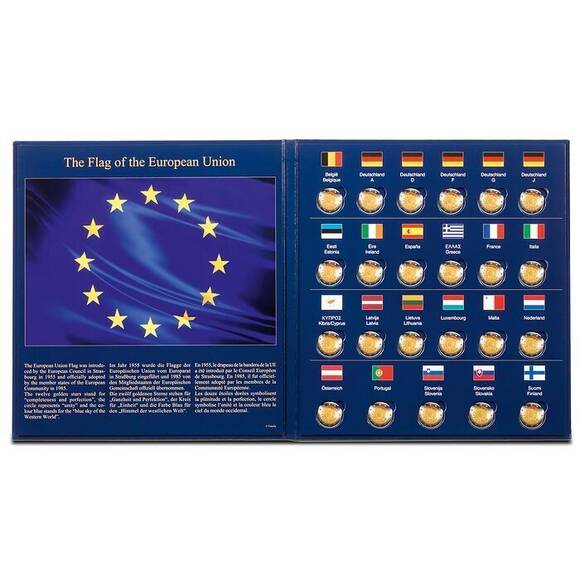 Münzalbum aus hochwertig bedrucktem, stabilem Karton mit passgenauen Ausstanzungen zum Eindrücken aller 23 europäischen 2-Euro-Gedenkmünzen zum Thema „30 Jahre EU-Flagge“
