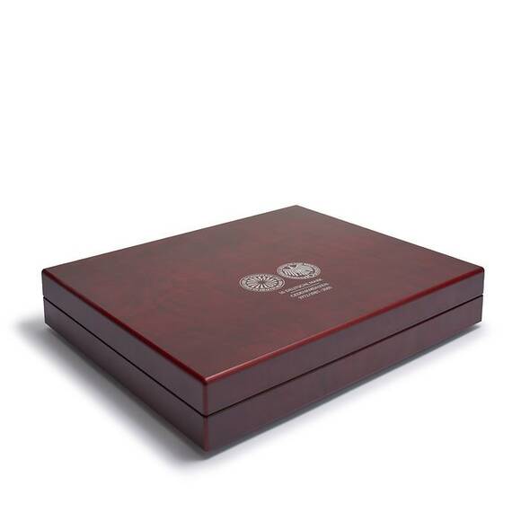 Kassette in mahagonifarbener Holzmaserung und Einlagen mit veloursartiger Oberfläche.