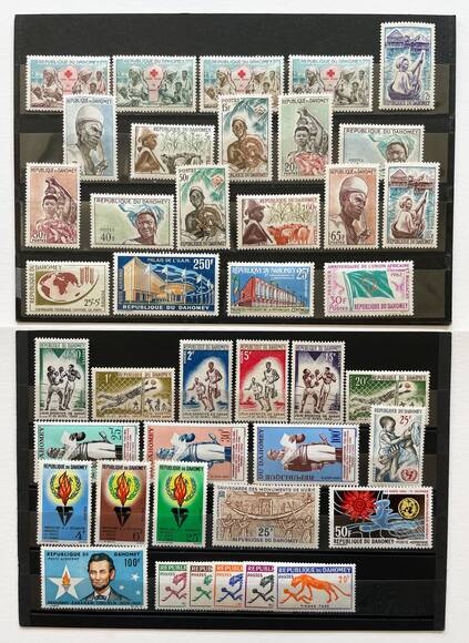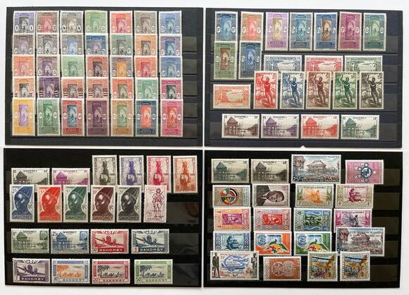 Anfangs ungebrauchte und später meist postfrische Partie Dahomey auf sechs Steckkarten mit verschiedenen Einzelmarken, Teil- und Komplettsätzen