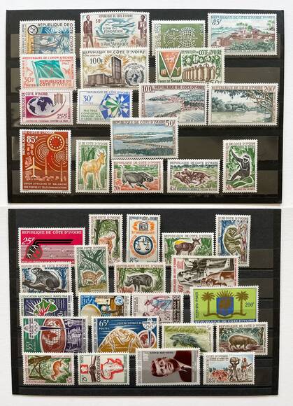 Anfangs ungebrauchte und später meist postfrische Partie Elfenbeinküste auf fünf Steckkarten mit verschiedenen Einzelmarken, Teil- und Komplettsätzen
