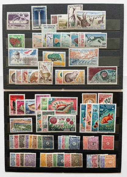 Gute Partie Französische Somaliküste / Dschibuti auf insgesamt 10 Steckkarten, dabei eine herrliche Auswahl gestempelter, ungebrauchter und später meist postfrischer Marken, mit Motiven, besseren Einzelwerten, Teil- oder Komplettsätzen