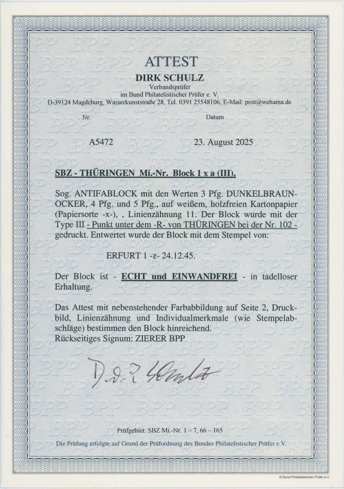Ideal gestempelt, Fotoattest Schulz