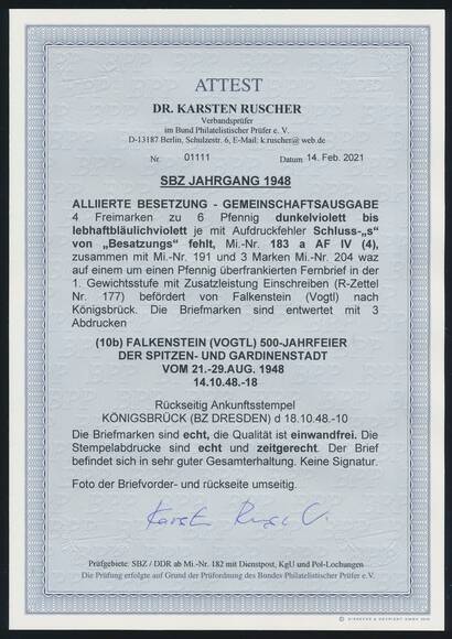 1948, Maschinenaufdruck, 6 Pfg., dunkelviolett, vier Stück, je vom rechten Rand