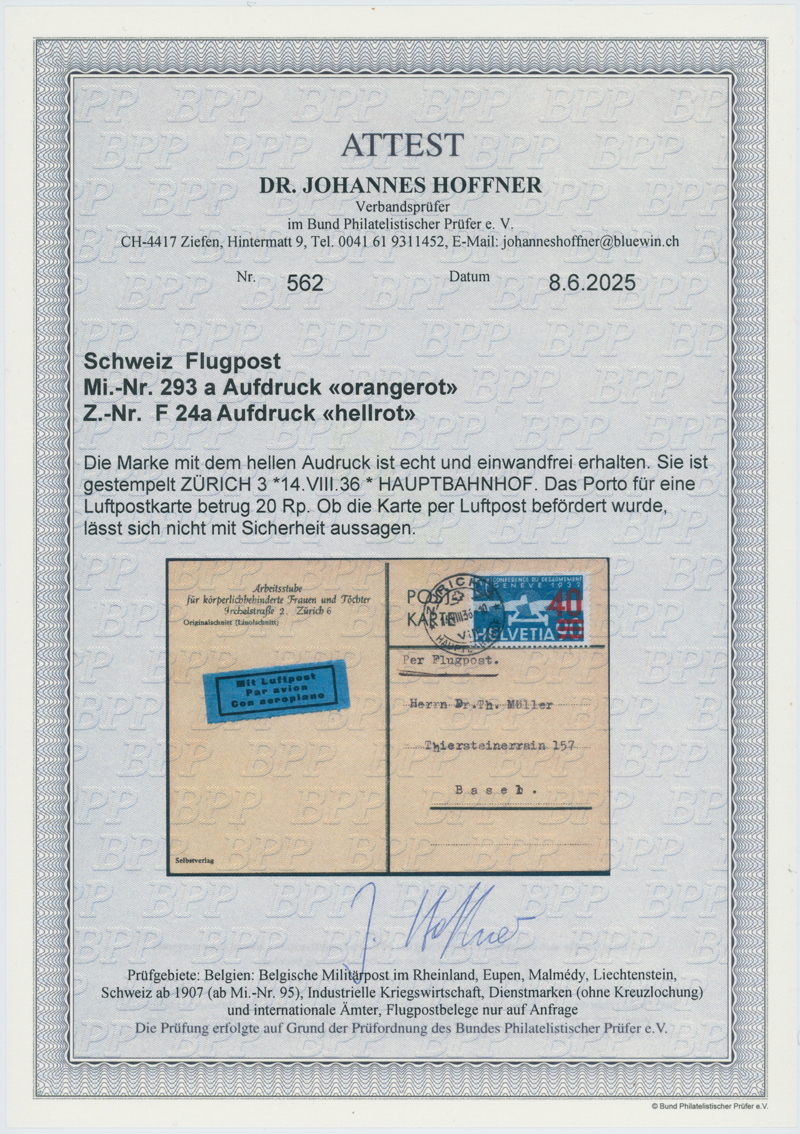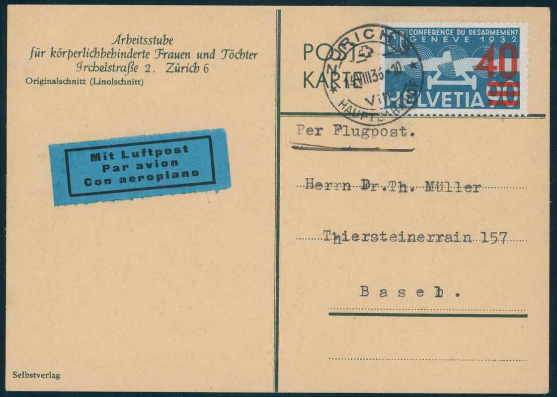 Als Einzelfrankatur auf überfrankierter Flugpostkarte von "ZÜRICH HAUPTBAHNHOF 14.VIII.36", adressiert nach Basel, das erforderliche Porto betrug 20 Rappen, ob die Karte per Luftpost befördert wurde lässt sich nicht mit Sicherheit aussagen