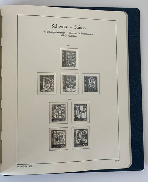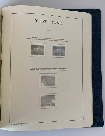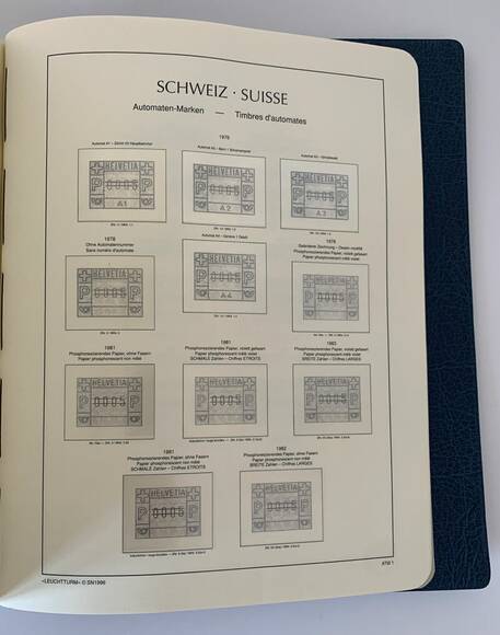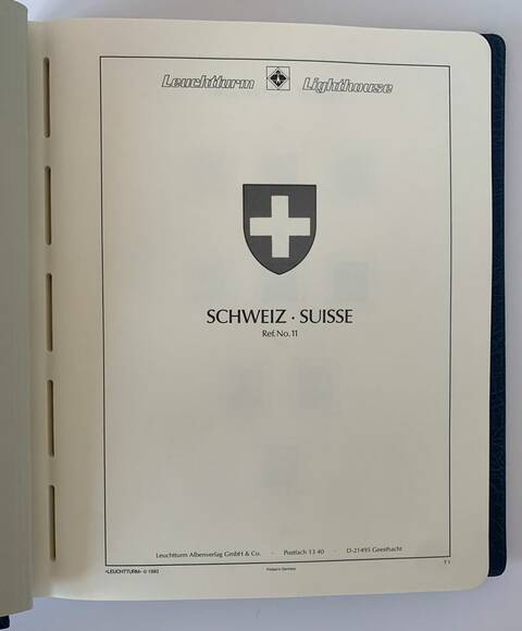 Leuchtturm SF-Vordrucktext Schweiz von 1907 bis 1999 untergebracht in zwei blauen Leuchtturm Perfect DP Drehstabbindern