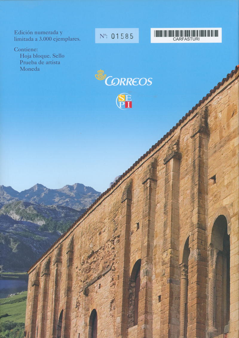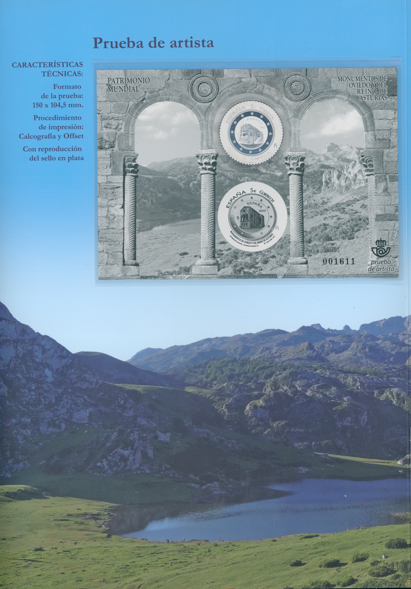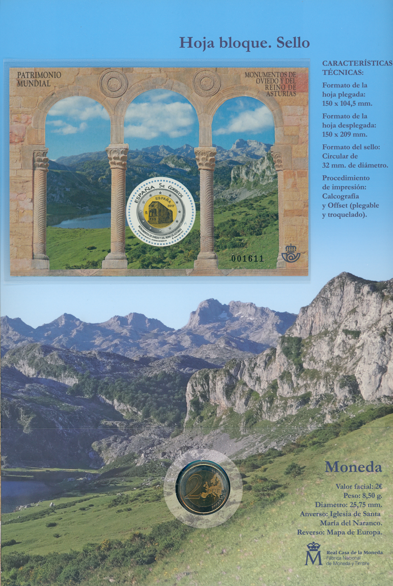 Die Mappe enthält neben der Münze eine Münzprobe aus Feinsilber und einen Briefmarken-Block der spanischen Post zu 5 Euro