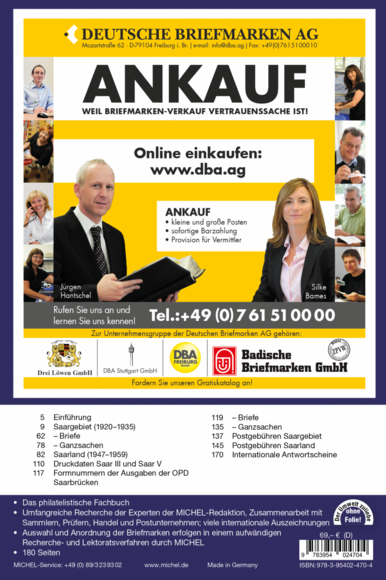 - Der MICHEL Saar-Spezial enthält Auszüge aus den MICHEL-Nachschlagewerken Deutschland-Spezial, Briefe-Deutschland und Ganzsachen-Deutschland kombiniert mit aktuellen Forschungsergebnissen der Arbeitsgemeinschaft Saar.